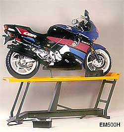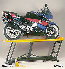 o reparación. Modelo EM500, Elevador para Moto con bomba hidráulica a pedal, completo con dispositivo de bloqueo de rueda. |